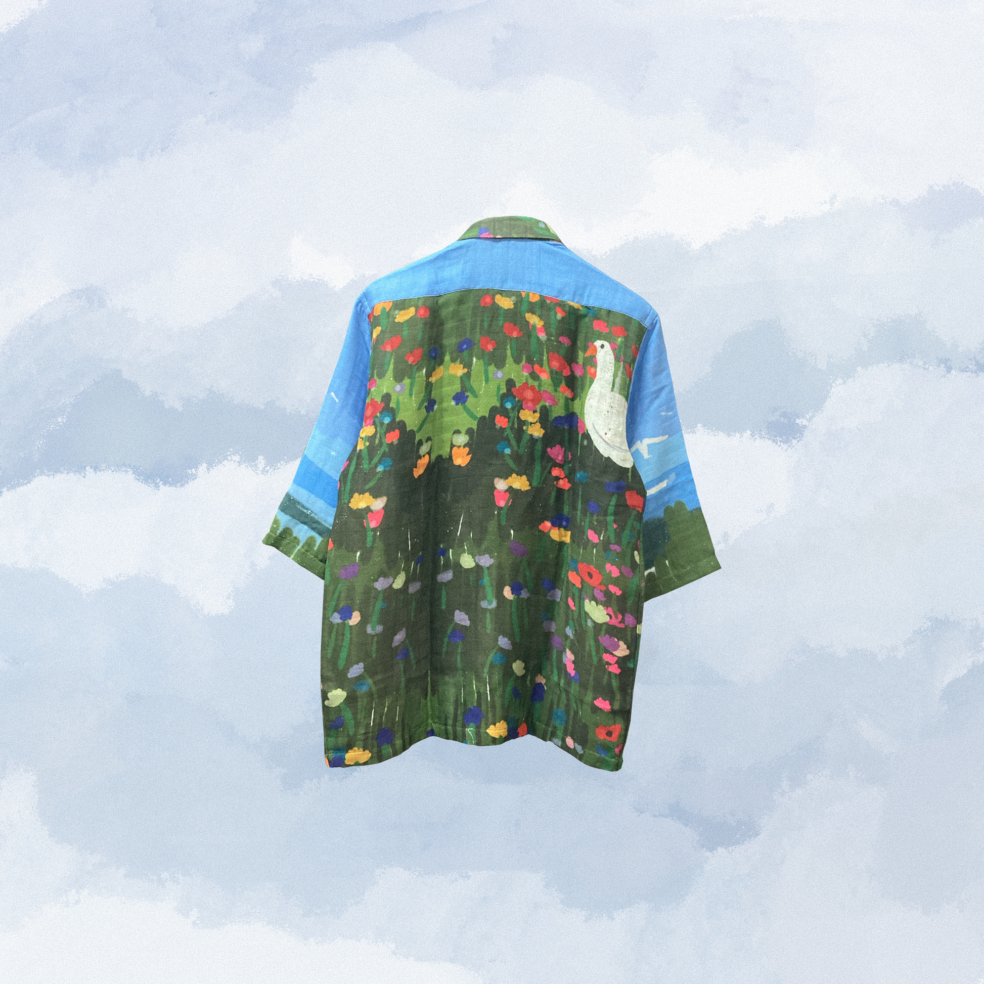 This shirt is made from organic muslin and printed with biodegradable dyes. Each shirt is cut and made upon order, and therefore the print placement will vary from the design shown on screen.