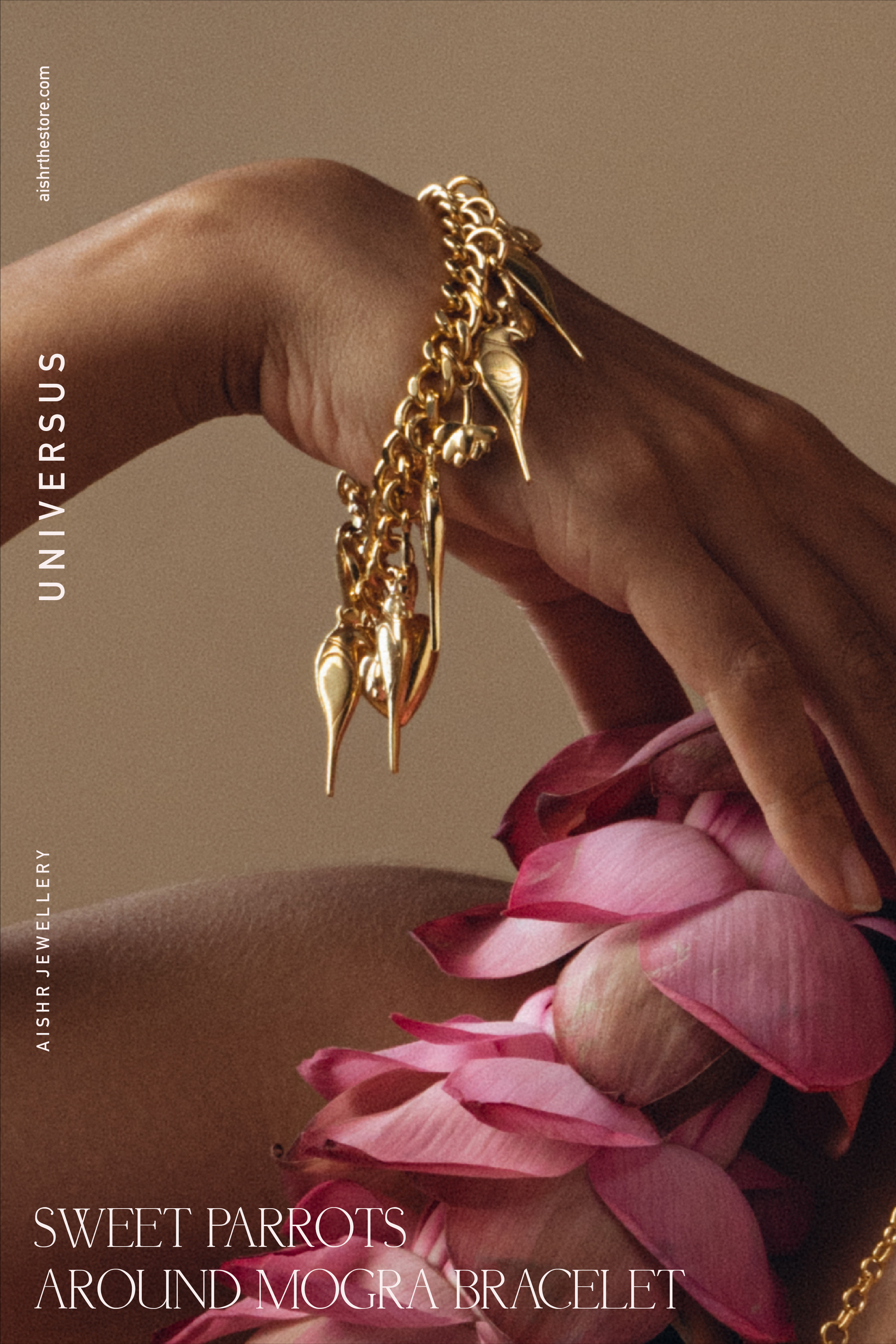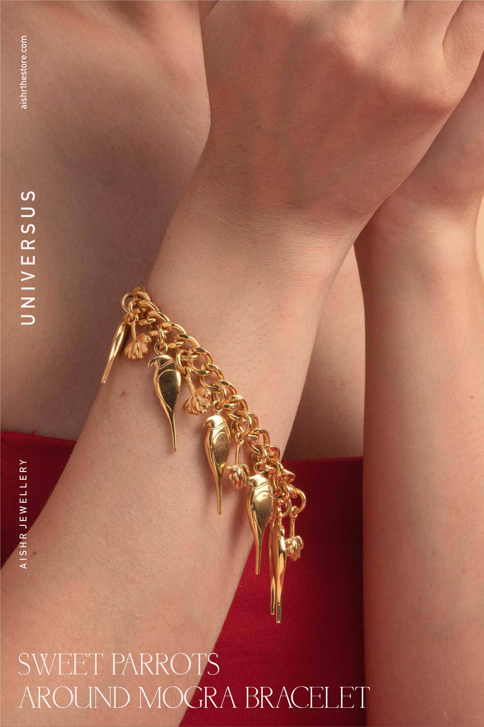 Handmade and handcrafted in 22k gold plated brass. This piece is inspired by sweet singing parrots with divine smelling flowers like mogra. A combination of perfect sweetness, to remind us about the simple pleasures of nature and life.